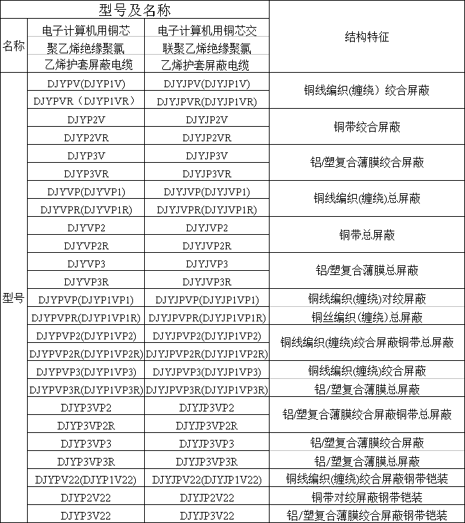 4.2.3 例: 電子計算機用銅芯聚乙烯絕緣聚氯乙烯護套編織總屏蔽電纜,額定電壓500V,四芯(2對),2.5mm2,表示為: